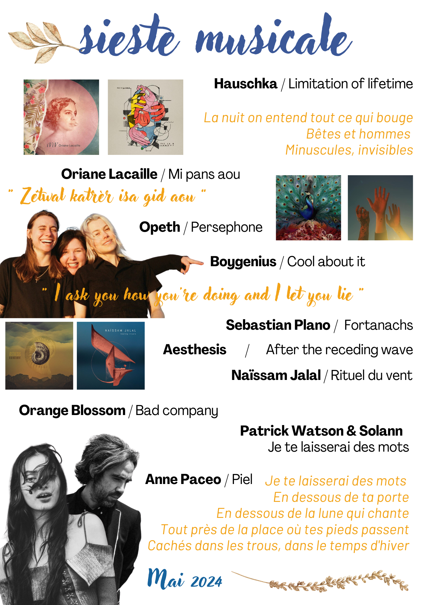 Vous avez raté une séance ? Retrouvez ci-dessous les différentes playlists en pdf ou écoutez directement les dernières siestes ICI.